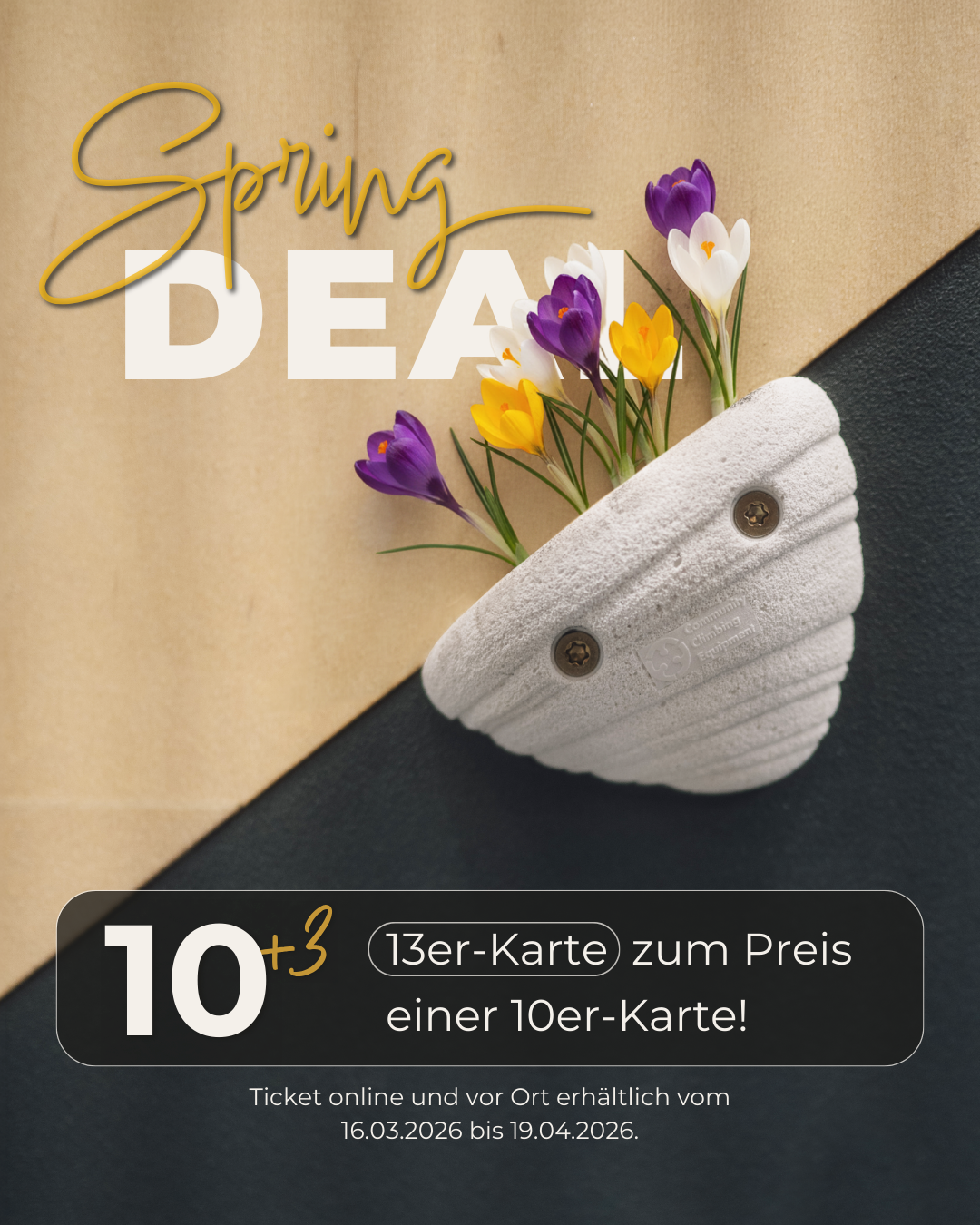 Unsere 10er-Karte bekommt ein limitiertes Upgrade: 13x bouldern zum Preis der 10er-Karte. Schnapp dir unseren Spring Deal zum Frühlingsstart und nutze deine frühlingserwachte Energie an der Wand!